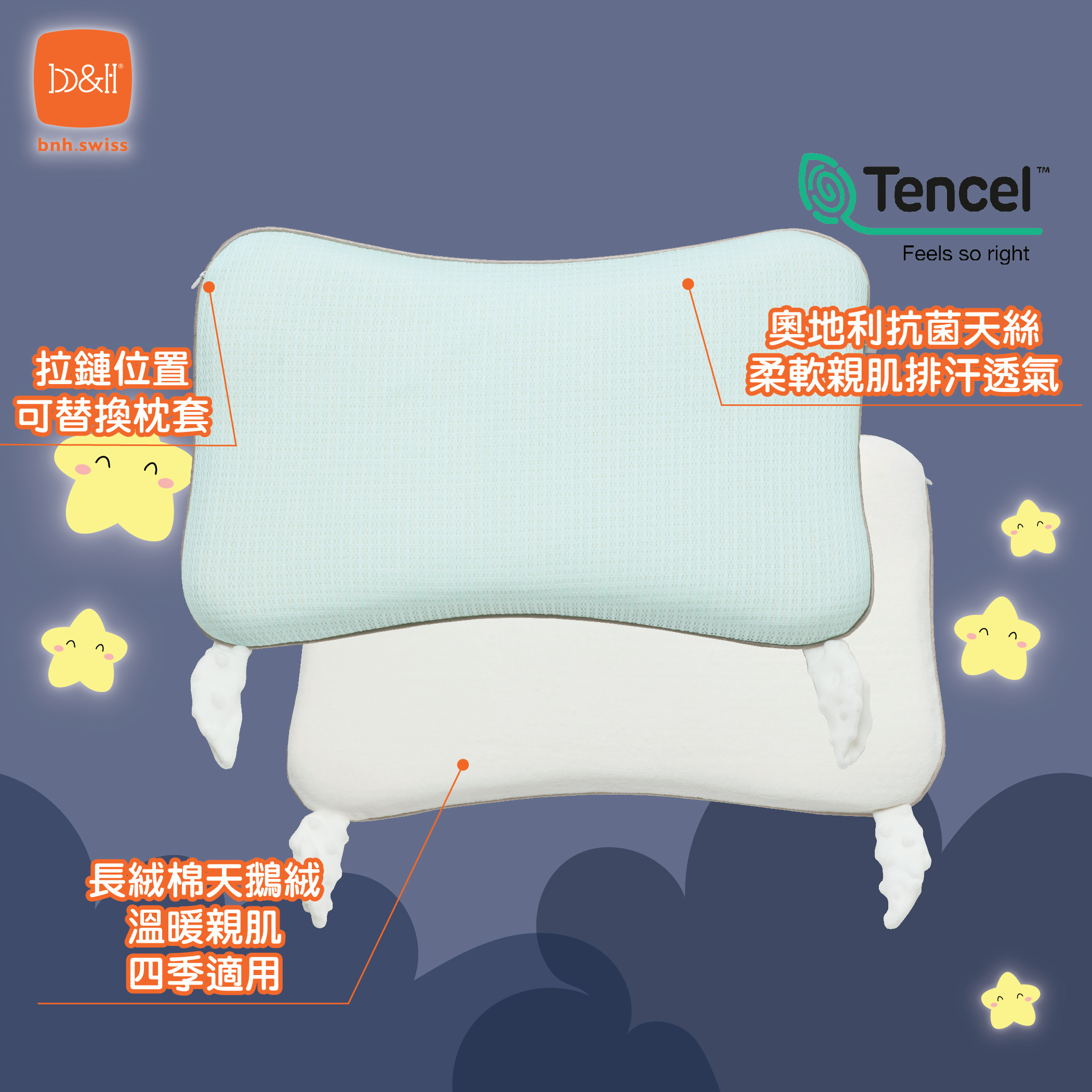 產品特色: * 專利可水洗親水棉枕芯, 具70D 高承托力, 持久耐用。 可100°C 高溫水洗及陽光下晾曬 * 抗菌防蟎內套, 低過敏又衛生, 保護家人免受有害過敏原的侵害, 可機洗 * 雙層式設計, 靈活配合嬰兒成長階段及不同睡眠姿勢習慣的需要 * 薄層 - 較薄, 適合半歲 - 1歲寶寶 * 厚層 - 厚度較高, 適合1-3歲寶寶 * 雙層組合 - 底層及加厚層結合運用, 適合3-7歲寶寶 * 防扁頭設計, 睡出漂亮頭型。弧面懸浮凹坑, 均勻分散頭部壓力, 有助頭骨和大腦的發育 * 配有三個塑型凹位設計, 透氣通爽, 不會隨著寶寶睡眠時間而升溫 * 配備 100% 長絨棉雙面可愛印花枕套, 柔軟舒適, 排汗透氣, 不易磨損, 不易起球, 四季適用 * 特有豆豆絨小抓手設計, 給嬰兒安撫作用, 提供安全感並刺激感官發展 * 無毒害 - 無螢光劑、無塑化劑、無甲醛及無樟腦等有害物質 規格: 尺寸: 枕頭 47 x 28 x 2.5cm, 薄層47 x 28 x 1.5cm 內容: 1 x 枕芯, 1 x 內套, 1 x 枕套 (帶安撫抓手) 適用年齡: 6個月至7歲 原產地: 中國 材質: 枕芯、薄層 – 100% 可水洗親水棉 (PU), 配聚酯纖維抗菌防蟎內套 枕套 - 柔軟透氣面料, 100% 長絨棉 洗滌方法: 枕芯連內套 – 可機洗 (最高100°C配合洗衣袋) 或手洗, 可陽光晾曬, 不可漂染, 不可熨燙, 不可乾洗 枕套 - 可機洗 (30°C配合洗衣袋) 或手洗, 不可漂染, 不可燙, 不可乾洗 注意事項: * 時刻遠離火源 * 寶寶睡覺時, 請時刻留意寶寶的狀況 * 如發現任何損毀, 請立即停止使用 * 請使用 B&H 瑞士寶琪的專用枕套, 切勿使用其他枕套或放置毛巾於枕頭上, 以免引致窒息 * 開封後請妥善處理包裝袋
